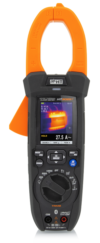 Cęgi HT9025T mierzą również rezystancję, częstotliwość, pojemność i temperaturę za pomocą sondy typu K oraz temperaturę w podczerwieni za pomocą wbudowanej kamery termowizyjnej o rozdzielczości 120 x 120 pikseli.