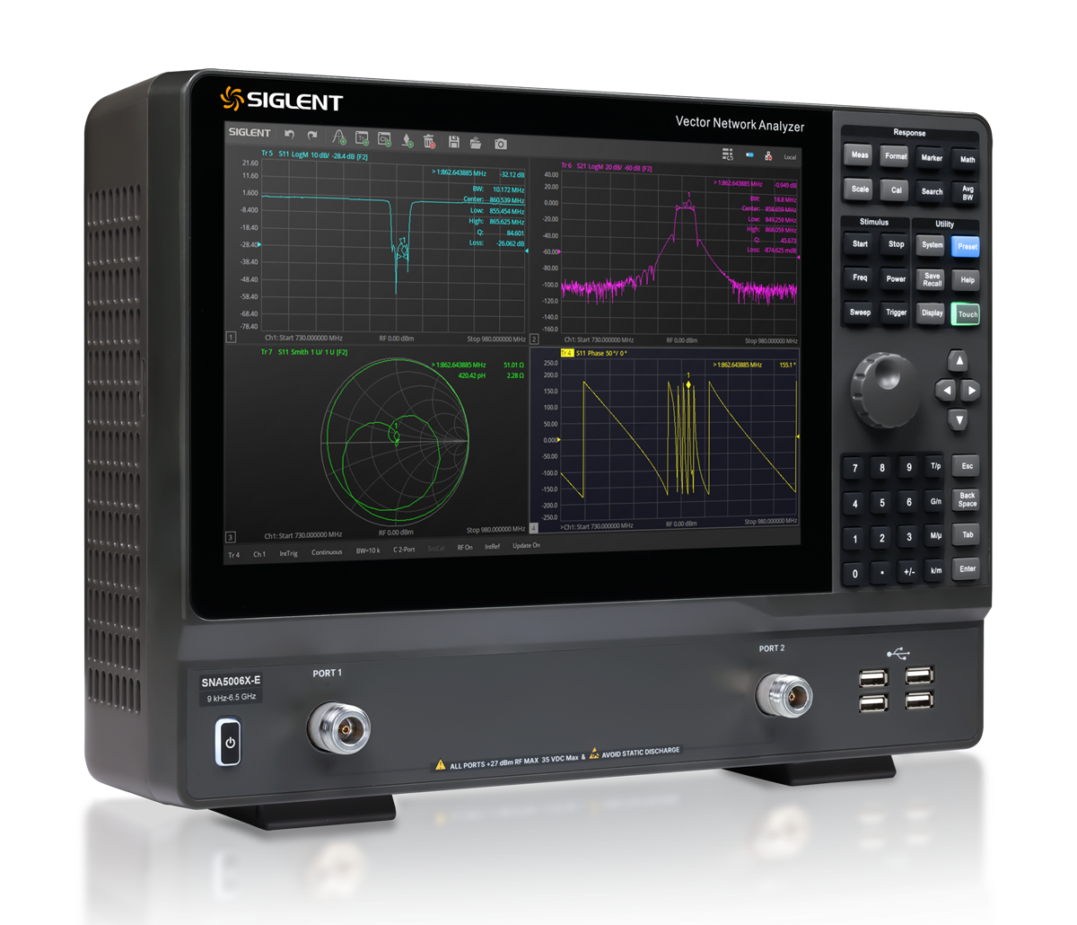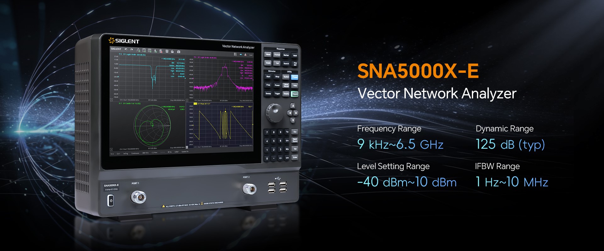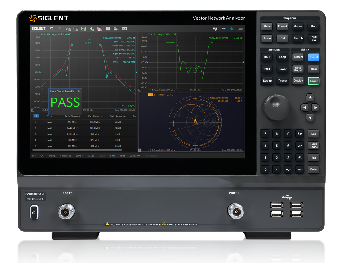 Analizatory sieci wektorowych SIGLENT SNA5000X serii E oznaczają zakres częstotliwości od 9 kHz do 6,5 GHz i obsługują dwuportowy pomiar parametrów rozpraszania, parametrów różnicowych i parametrów w dziedzinie czasu.