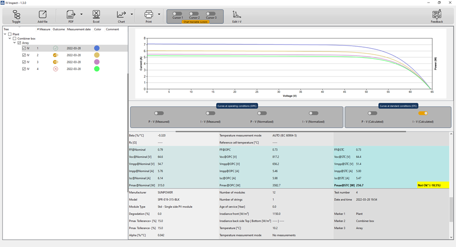 (standardowe warunki testowe: 1000 W/m2, 25°C, AM 1,5) i porównuje je z wartościami nominalnymi dostarczonymi